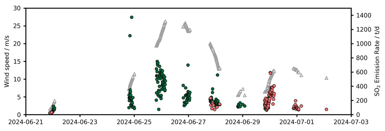 Processed scan data from the CLNE and CLES scanning DOAS instruments for a period of elevated gas emissions from June 21–July 3, 2024. SO₂ emission rates, in tons per day, are indicated by the green (CLNE) and orange (CLES) circles. Wind speeds are indicated by the grey triangles.